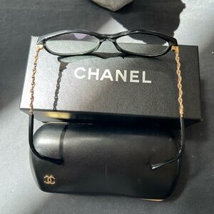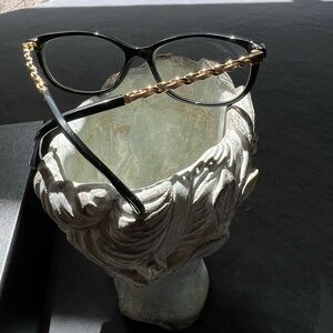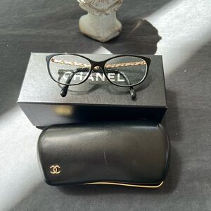 Black acetate eyeglasses frames from Chanel with gold tone interlinking metal chain and beige tan ribbon leather detail