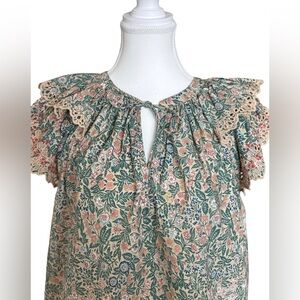 Romantic Ulla Johnson blouse in a soft botanical print with signature lace-trimmed flutter sleeves and scalloped hem. Lightweight cotton with beautiful texture and movement. Easy, floaty silhouette that works tucked or loose. A gorgeous transitional piece for spring through fall.