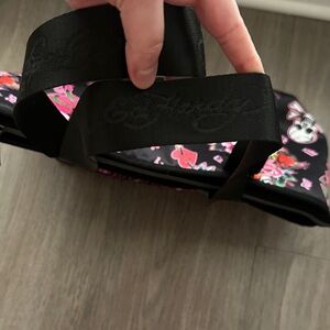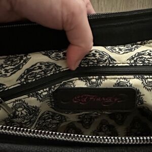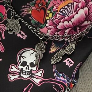 Bold Ed Hardy tote featuring a striking skull design with pink and white florals against a black and pink backdrop—perfect for making a statement. The bag is spacious inside, with two interior pockets plus a secure zippered compartment to keep essentials organized. “Ed Hardy” is inscribed along both handles, and the top fully zips closed. Tags have been removed, but the purse has never been used. Comes from a smoke and pet free home.