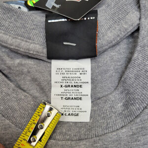 This 2024 Harley Davidson T-shirt captures bold biker spirit with its green skull mohawk gripping motorcycle handlebars and “Biker to the Bone” ribbon on front. The back features Teddy Morris’ Daytona branding for authentic event appeal. Gray fabric shows no wear except a subtle spot that’s hard to spot. Perfect for Harley enthusiasts or casual rider looks.