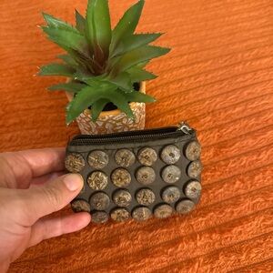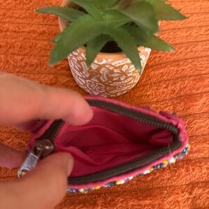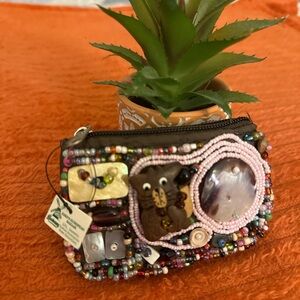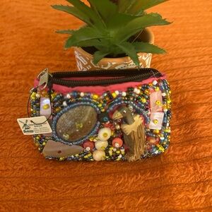 Vibrant beaded coin purse with multicolor design. Features unique embellishments and a secure zipper closure.