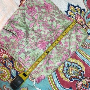 A simple cotton skirt in what is recognizably a lily fabric, a minty, green and pink floral hundred percent cotton bag, zipper and a back button pocket fully lined. Excellent condition.