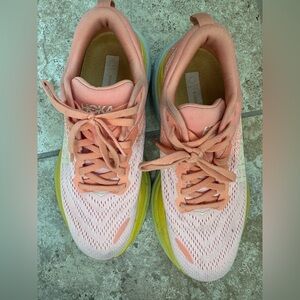 Vibrant Hoka shoes with a striking yellow sole. Ideal for running and workouts. Lightweight and supportive design.