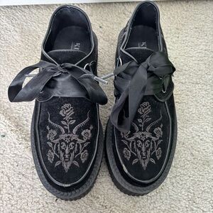 Elevate your look with Killstar's black loafers. Features bold embroidery and sleek platform. Perfect for a standout style.