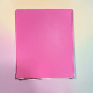 Bright pink Barbie doll case featuring a stylish illustration of a woman in a blue dress. Elegant floral accents frame the design.