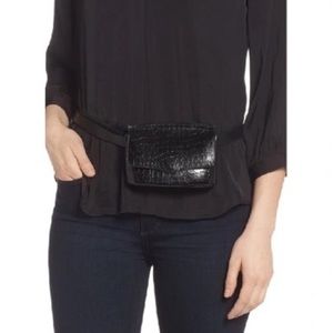 Genuine Leather Rebecca Minkhoff black belt bag. Small flap micro clutch attached to adjustable belt. Silver tone O ring. Crocodile pattern.
