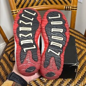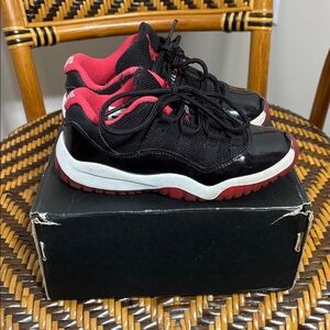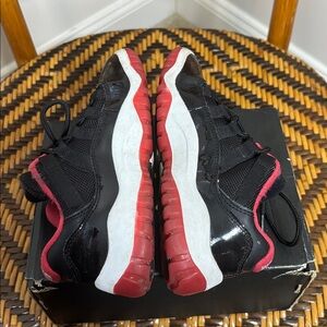 Jordan 11 Low Bred low top retro basketball sneakers. Good condition as shown, used but no major flaws. Includes the replacement box shown