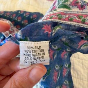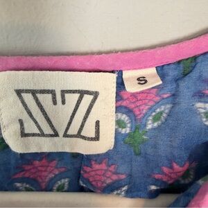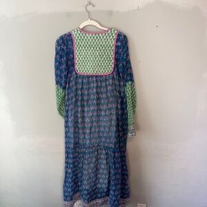 Charming blue dress with green sleeves and pink floral patterns. Features pink tassels and intricate detailing.can be worn as a coverup, daydress or out for dinner. Hand block printed on the finest silk and cotton blend fabric, she is delicate, feminine and versatile, and can be trusted to deliver year-round! Size Small, measurements in photos. Good preowned condition with no major flaws, some pilling on the quilted top.