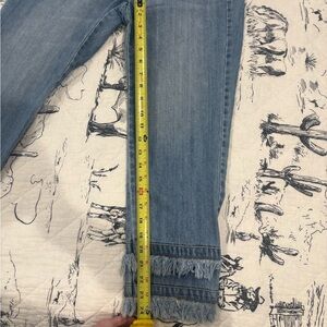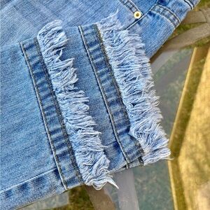 Stylish blue jeans with a trendy frayed hem. Perfect for casual outings.