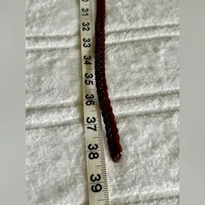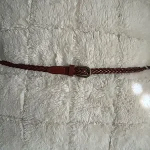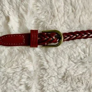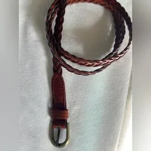 Stylish braided faux leather belt featuring a brass buckle. Perfect for adding a touch of elegance to any outfit. Please see photos for measurements. Excellent condition.