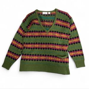 Chic V-neck sweater with vibrant green and pink pattern. Perfect for a stylish look.