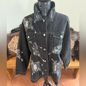 Stylish black jean jacket with unique artistic patterns with rhinestones, sequins and stunning metallic embroidery with tassels. Features button front closure, button wrists closure, 2 front flap button closure chest pockets and classic collar. Perfect for a creative flair. Size Large
