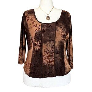 Large oval shaped cabochon with naturally banded agate with warm rust, cream, and honey tones. Ornate gold tone frame with leaves surrounding the cabochon. On a replacement 17.5” gold tone chain with a spring ring closure.