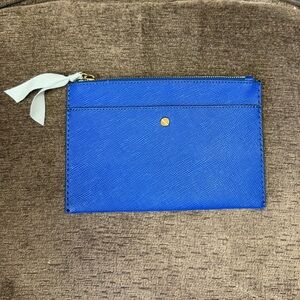 J. Crew Italian Leather Medium Sized Pouch in Blue with Gold Accents. Features a zipper closure and a decorative ribbon. GUC with no rips, tears, stains, or repairs. Like new.