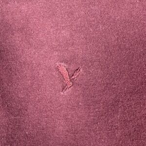 American Eagle Super Soft Standard Fit t-shirt in a rich burgundy color. This classic short-sleeve tee features a comfortable crew neckline and the iconic eagle logo embroidered on the chest. Crafted from a soft cotton blend, it offers a relaxed yet structured silhouette suitable for everyday wear.