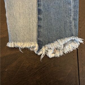 Stylish high rise jeans. Unique two-tone design. Frayed hem for a trendy look.
