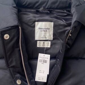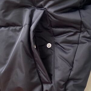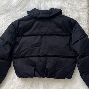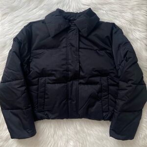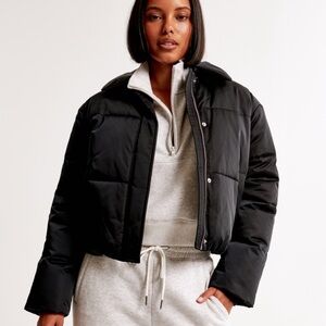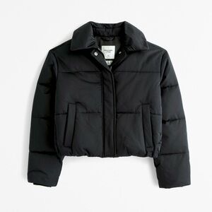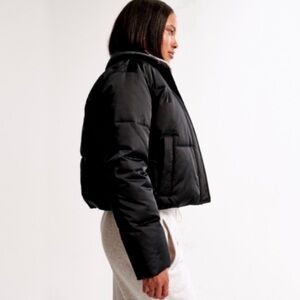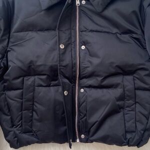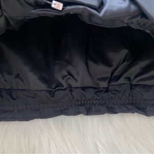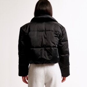 puffer in a soft satin fabric and short length, featuring zip-front closure with concealed snaps, storm cuffs and recycled fill to protect against the elements. size small.