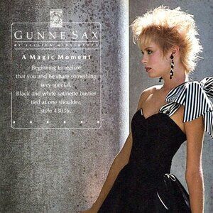 Step back into the romantic drama of the 1980s with this vintage Gunne Sax prom gown — a rare collector’s find! This black satinette dress features a sweetheart bustier bodice, one-shoulder tie strap, and an oversized striped bow that gives it the perfect mix of vintage elegance and edgy glam. Perfect for collectors, formal events, gothic-inspired weddings, cosplay, or being the Belle of the Emo Prom