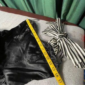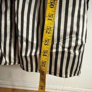 Crafted with luxurious black satin layered over bold black-and-white stripes, the gown flows into a full southern belle-inspired skirt that delivers movement and volume. Perfect for collectors, gothic formal looks, themed proms, or anyone wanting a statement piece with timeless flair.