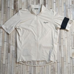 Excellent condition, like new, Rapha cycling jersey in cream and black colorway. Easy to style, super comfortable and an elevated look, this everyday jersey that sets the standard in performance and comfort. The Rapha Core Cycling Jersey has a stretchy fabric that moves with you when you're pedaling hard.