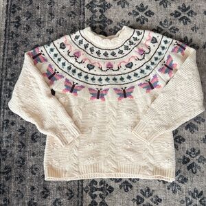 Chic cream sweater with pink and blue accents. Features a cozy turtleneck and intricate patterns. Ideal for casual wear.