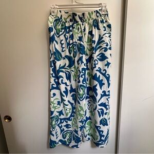 Stylish dress with blue and green patterns. Ideal for any occasion. Linen, cropped pant. Tie front top.