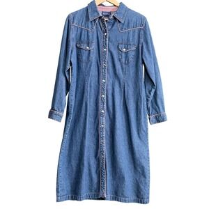 Blue J denim maxi dress crafted from 100% cotton with a medium wash finish. This Western-inspired piece features a full snap-front closure with silver-tone hardware, classic pointed yokes, and red gingham piping along the seams and collar. Designed with long sleeves, button cuffs, and two snap-flap chest pockets, it offers a structured yet comfortable A-line silhouette perfect for a rustic or cowgirl aesthetic.