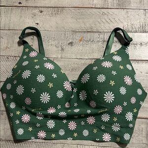 Green bra with floral pattern. Features pink and white flowers. Adjustable straps.