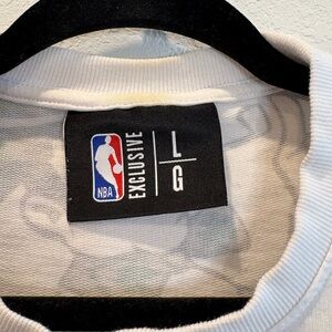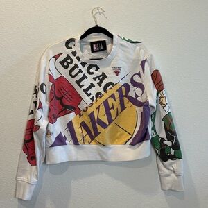 Bold and eye-catching NBA Exclusive cropped sweatshirt featuring oversized graphics from multiple NBA teams including Chicago Bulls, Los Angeles Lakers, Boston Celtics, and Miami Heat. Statement piece with vibrant front and back prints.