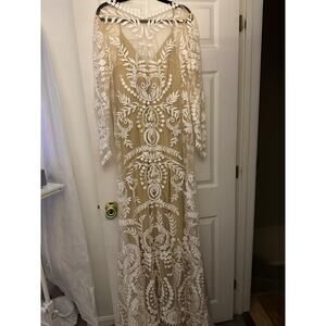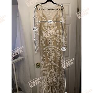 Get ready to say 'I do' in this absolutely breathtaking Nude and Lace Wedding Gown! This exquisite dress is brand new with tags, ensuring it's in pristine condition for your special day. The delicate lace detailing creates a romantic and elegant look that is sure to turn heads.