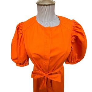 Button up closure, tie belt, statement sleeve, bright orange! Size medium but fits a small!