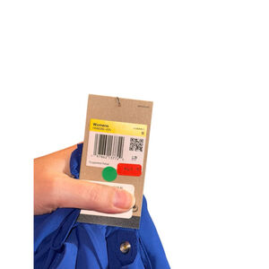 This is a women's blue long-sleeved button-up shirt, size small, by Nike. It features a collared neckline, a button-down front closure with silver-toned buttons, a single chest pocket, and pleated detailing at the cuffs. The back of the shirt has a yoke with pleats for structure. The fabric appears to be lightweight and smooth. The item is new with tags attached, including pricing Product Information