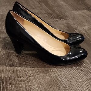 These Calvin Klein heels feature a glossy black patent leather finish, a pointed toe, and a medium-height heel for a sophisticated and elegant look.