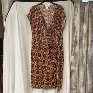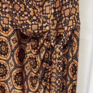 Discover elegance with this geometric midi dress. Featuring a bold black and orange pattern, it's designed to make a statement. Perfect for any occasion.