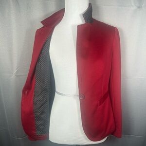 This vibrant red one-button career blazer from The Limited is a professional wardrobe essential with a playful twist. Expertly tailored with a structured silhouette and classic notched lapels, it features a signature black-and-white polka dot lining that adds a pop of personality when the sleeves are cuffed. Perfect for the office, holiday events, or elevating a casual denim look, this versatile piece is made from a comfortable stretch blend that offers a polished fit without sacrificing movement.