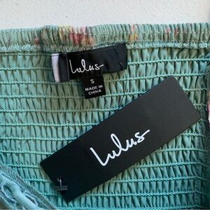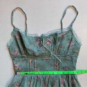 Flirty Dreamer Sage Floral Bustier Lace Ribbon Mini Dress from Lulus. This dress is crafted from a lightweight, woven chiffon fabric with a ditsy floral print. Features: Adjustable spaghetti straps, bustier style bodice with seamed details, sweetheart neckline with a keyhole details, mini length skater style skirt. There is also lace trim with sheer (unlined) lace accents under the bust. Smocked back panel. Side zip closure. Hand wash. The fabric does NOT have stretch.