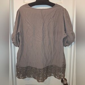 Elegant taupe blouse with lace trim. Buttons up front. Perfect for casual or dressy occasions.