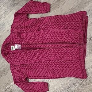 Elegant hooded cardigan by Aran Crafts. Rich purple hue. Perfect for warmth and style.