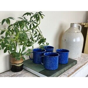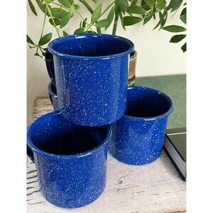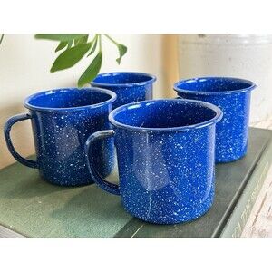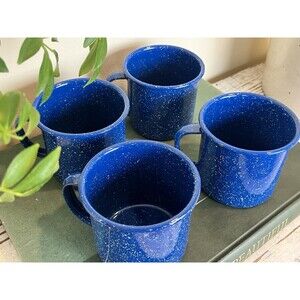 Vintage Blue Speckled Enamelware Metal Coffee Cups Mugs Set Of 4, Cabin Camping