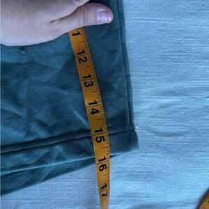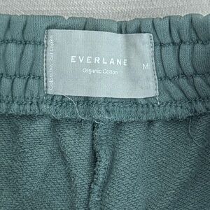 Everlane organic cotton lounge shorts in a muted sage green. Size M with elastic waistband and adjustable drawstring. Soft fleece interior with side pockets. Easy relaxed fit, perfect for everyday wear, athleisure, minimalist basics, capsule wardrobe, neutral street style.