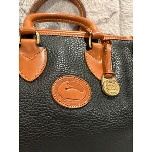 Vintage Inspired Dooney & Bourke All Weather Leather satchel bag in a classic black and tan colorway. This timeless doctor bag silhouette features the iconic pebbled leather texture, brass hardware, and the signature duck logo patch on the front. It includes a brass logo hangtag and a sturdy top handle design. The interior is well-organized with multiple slip pockets and a zippered compartment for essentials. Perfect for collectors of heritage American leather goods.