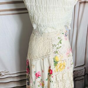 Chic cream maxi skirt with vibrant floral designs. Perfect for adding elegance to your style.