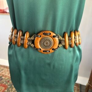 vintage wooden belt, boho statement belt, carved wood belt, metal accents, leather cord belt, earthy chic, 1970s style, festival fashion, hippie style, artisan belt, handmade look, adjustable belt, unique vintage accessory, retro belt, eclectic jewelry