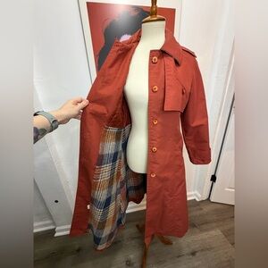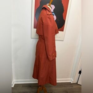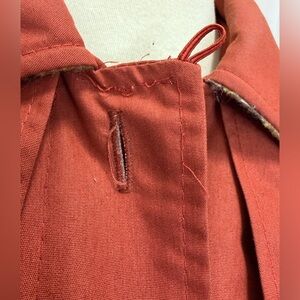 Beautiful 1970s coat in a rich rust tone with classic tailoring and a flattering tie waist. Structured silhouette with wide collar and button front closure. Warm without being bulky.