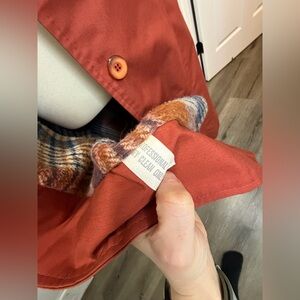 The interior is fully quilted through the body and sleeves, with thick flannel lining along the lower portion. Flannel also lines underneath the collar for added warmth and detail. Fabric is not labeled as waterproof but feels water resistant. Coat is marked dry clean only.