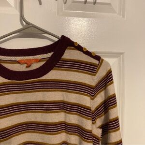 Cream colored sweater with purple and gold stripes. Elbow sleeves and little wooden button detail on shoulder.