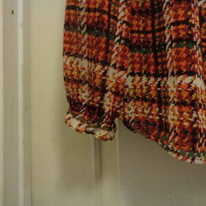 FALL COLORS LONDON PLAIDS ROMANTIC GATHERED BLOUSE BY JONES NEW YORK PM. THIS IS SUCH A PRETTY BLOUSE. IT WAS MADE IN CHINA. IT IS POLYESTER AND IT HAS A LINING. TIES AROUND NECKLINE AND RUFFLES. RUFFLES AND ELASTIC AROUND WRISTS. FROM UNDERARM TO UNDERARM ALL THE WAY AROUND THE ITEM IS 38 INCHES. WITH LIGHT WEAR YET PLENTY TO SHARE WITH YOU LUCKY BUYER. 6TH GROUP. #75. THANKS