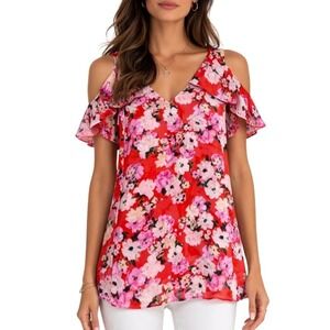Cabi Red Floral Cold Shoulder Ruffle Sleeve Womens Top V-Neck Blouse 5352 Medium