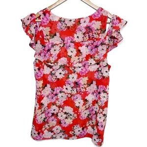 Cabi vibrant floral print top features a striking red base adorned with pink and white blossoms. Designed with a feminine V-neckline and playful cold-shoulder cutouts, it is accented by fluttery ruffle sleeves. A tiered ruffle detail across the back. Like new, no flaws. Size M. Machine wash cold delicate. Made in China.