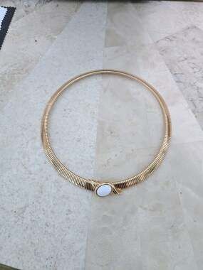 Vintage Monet Jewelry featuring a gold-plated omega collar necklace. The necklace showcases a prominent white oval cabochon center stone set in a polished gold-tone frame.